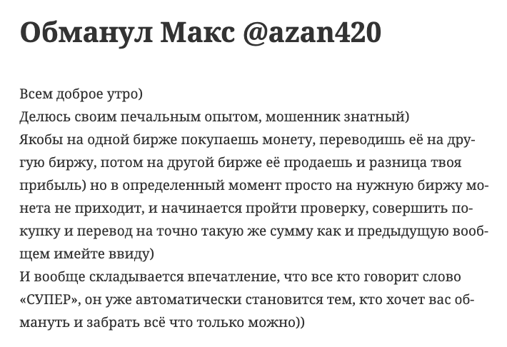 Автор единственного ревью, в котором упоминается Макс, предупреждает, что данный человек может являться мошенником. В этом сообщении кратко рассмотрена схема, по которой работает azan420. Она сильно напоминает мошенническую систему, которую мы рассмотрели выше.
