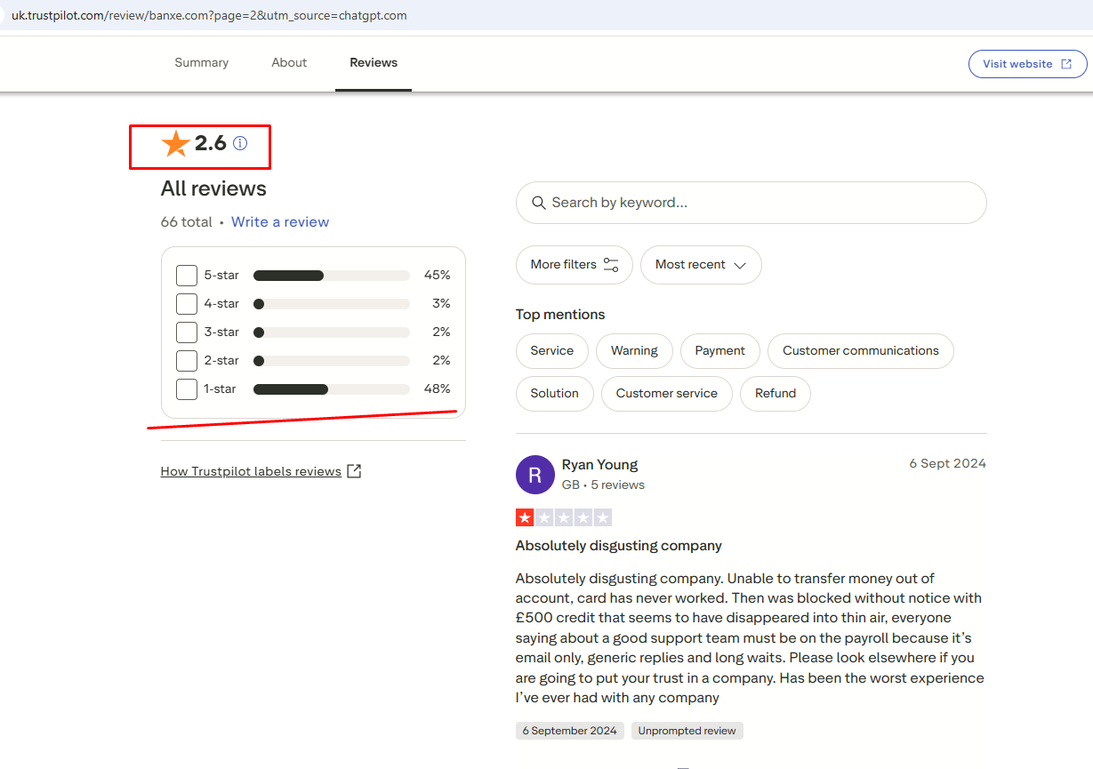 Отзывы о платежной системе Banxe в большом количестве встречаются на Trustpilot. Заглянув сюда, сразу бросается в глаза низкая пользовательская оценка. Она составляет всего 2,6 балла. Причем 48% пользователей, то есть почти каждый второй, ставит единицу.