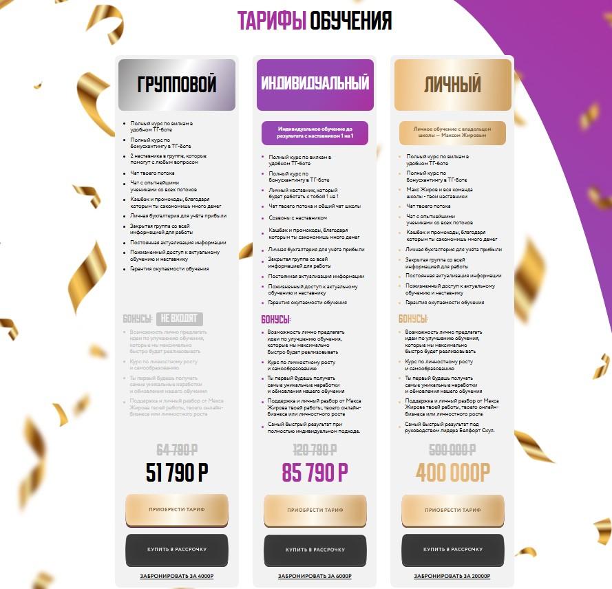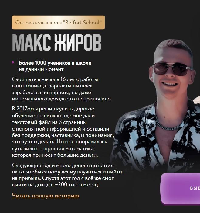 Курс Belfort School может оказаться обычным инфоцыганством. Эффективность обучение у Макса Жирова не доказана, как и его профессионализм в заработке на «вилках». При этом цены на курсы солидные. Стоит ли тратить их на эту программу, решать вам. Но мы бы не советовали.