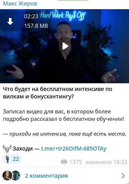 Максим ведет канал в Телеграме. У него есть переходная группа – «Макс Белфорт переходник» (belfortman), где указана ссылка на актуальное сообщество – «Макс Жиров». На него подписано 7 439 человек. Но активность невысокая. Посты читают в среднем 1 000 фолловеров, а реакций и комментариев порядка 20-30.