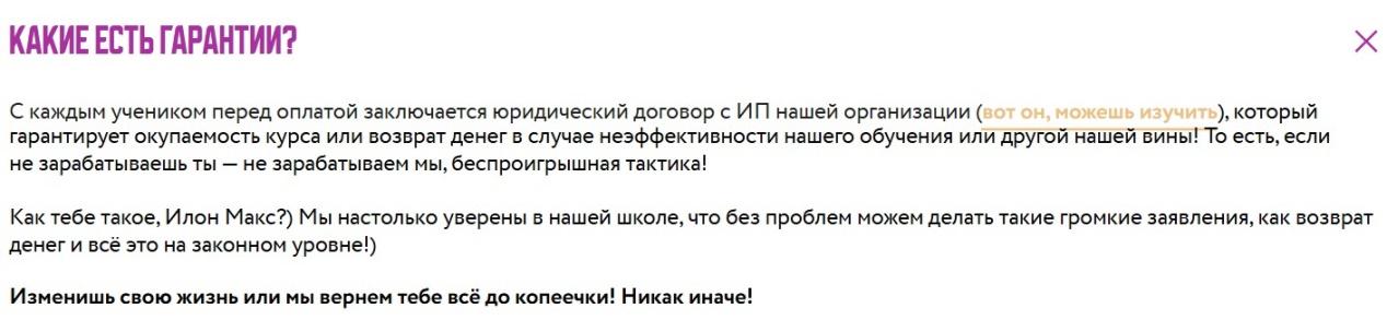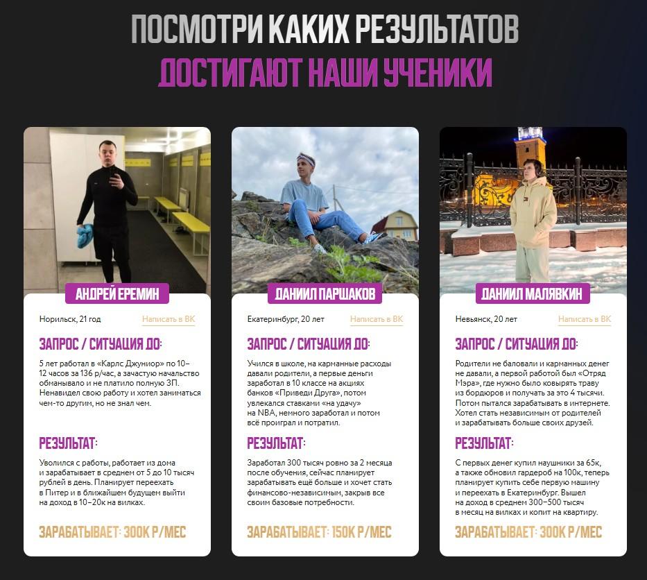 Максим обещает постоянную обратную связь, наставничество, доступ в общий чат с учениками и кураторами. Чтобы вызвать доверие к своему курсу, он разместил три кейса учеников. Даже даны ссылки на их страницы ВКонтакте, чтобы можно было написать им и убедиться, что их истории – не выдумка. Однако это могут быть подставные лица.