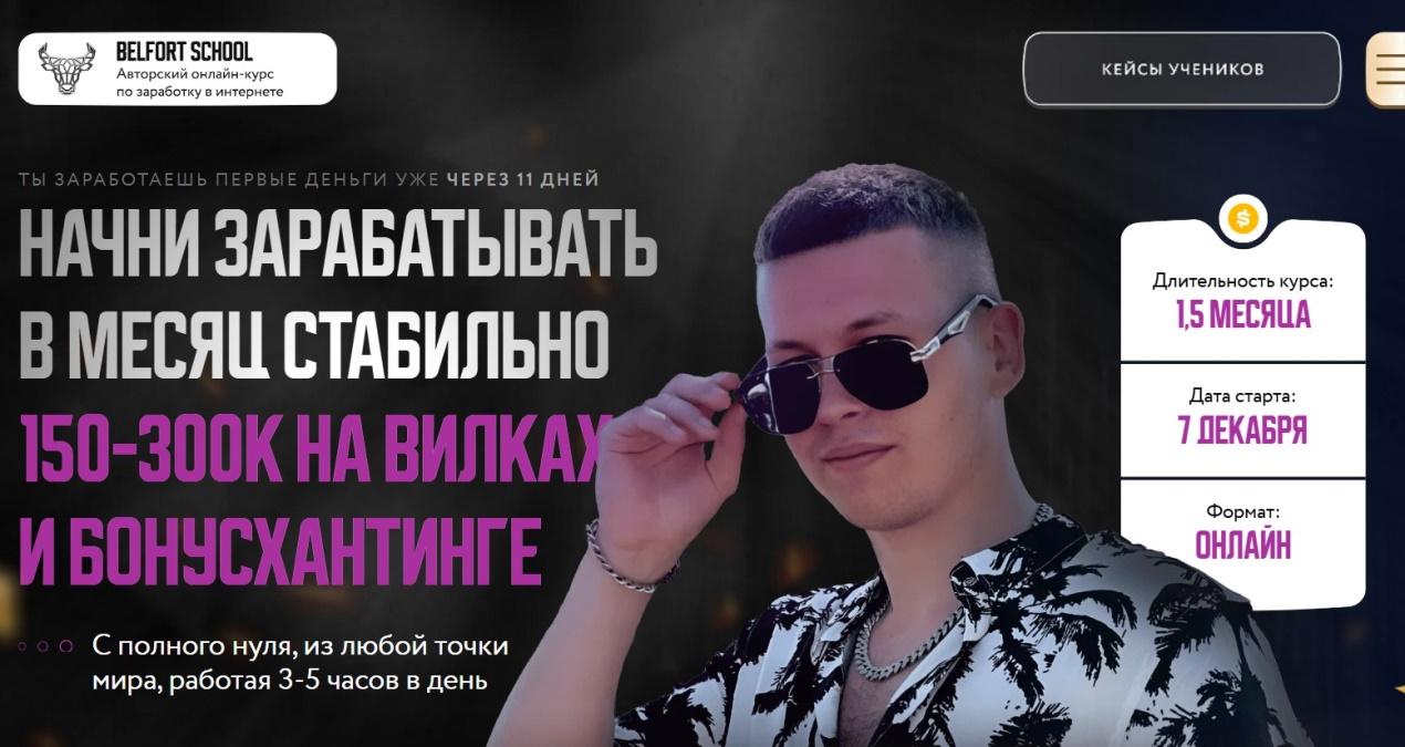 Курс Belfort School презентован на сайте belfort school ru. Обучение проводится онлайн в Телеграме и длится 1,5 месяца. Максим Жиров обещает научить зарабатывать на «вилках» и бонусхантинге. Уверяет, что первые деньги ученики смогут получить уже через 11 дней обучения по его программе, а в дальнейшем – 150 000-300 000 рублей ежемесячно. Курс подходит всем, кто желает зарабатывать достойно и стабильно, не выходя из дома.