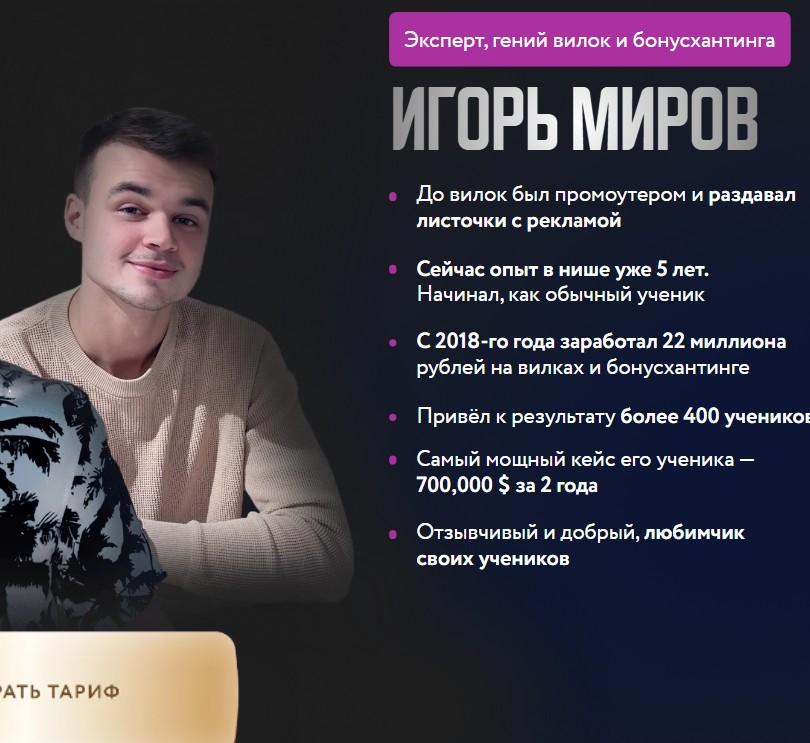 Максим Жиров рассказывает, что еще в 2017 году прошел обучение по вилкам и в течение года сумел полностью разобраться в этой теме, выйдя на ежемесячный доход около 200 000 рублей. Насколько информация о нем достоверна, сказать сложно, так как реальные кейсы автор курса не демонстрирует.