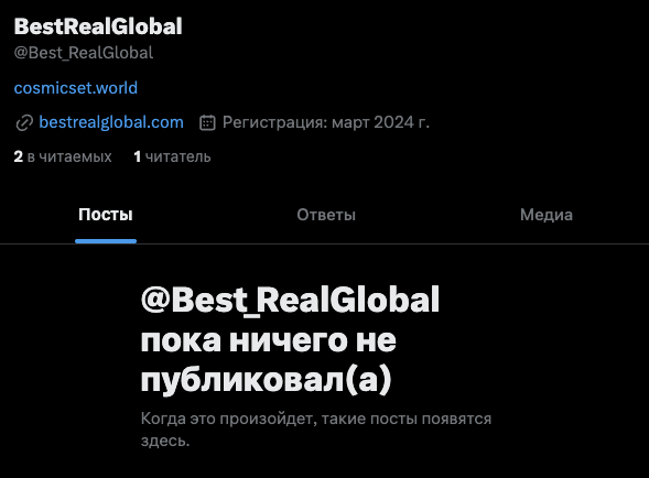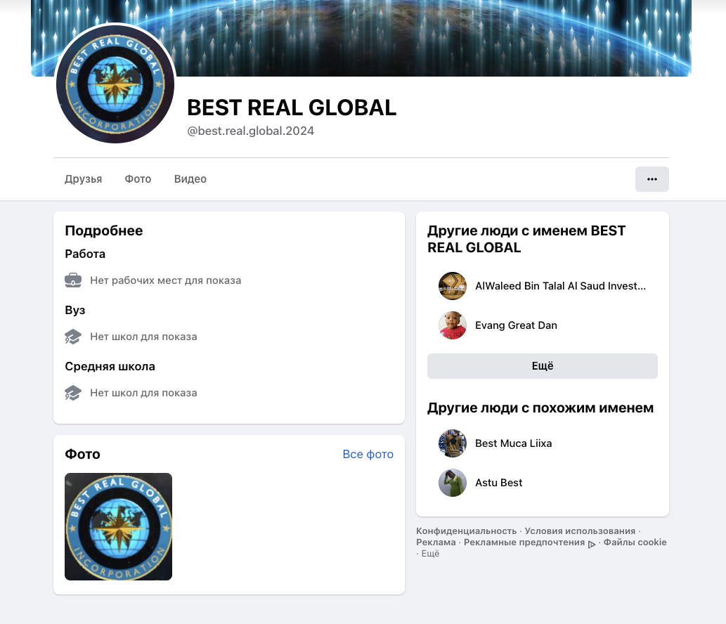 Еще один аккаунт проекта — это страница best real global 2024 на Facebook. На ней нет и никогда не было публичной активности.