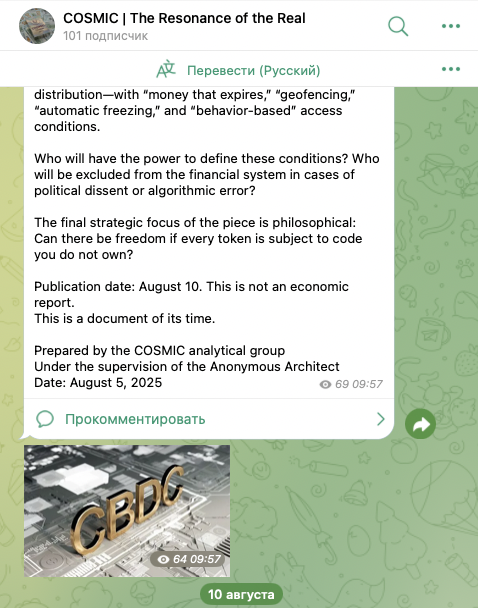 У проекта есть тг-канал, который называется Cosmic The Resonance of the Real. На 28 сентября 2025-го года на него подписан 101 юзер. Публикации в ленте получают всего по 50-70 показов.