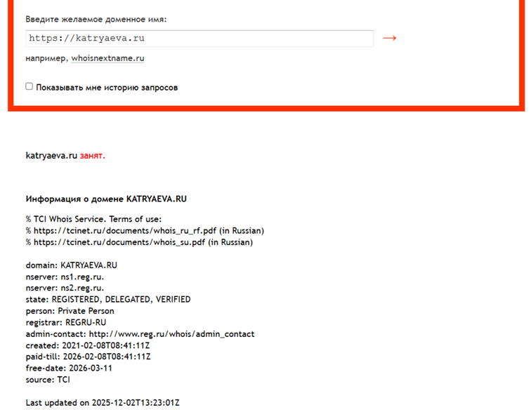 Отзывы клиентов о банкротстве от Натальи Катряевой свидетельствуют об обмане со стороны этого юриста. Мы узнали, что используются манипуляции со сроком работы сайта. Доменное имя зарегистрировано в 2021 году, но только в 2025 оно перешло сервису, принадлежащему юристу по банкротству. А продлено оно до 08.02.2026 г.