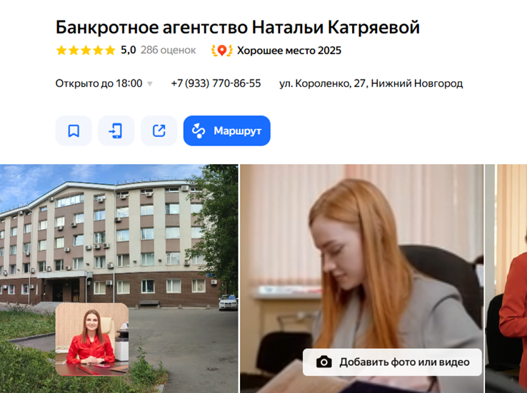 Банкротство физических лиц с Натальей Катряевой доступно всем, но сначала важно проверить деятельность этого юриста. Публичная информация из сервиса «Яндекс.Карты» свидетельствует о том, что компания действующая. Указано, что организация находится в Нижнем Новгороде по ул Короленко д 27. Заведение работает ежедневно с 9 до 18 часов, кроме субботы и воскресенья.Разоблачение юриста Натальи Катряевой начинают с проверки ее деятельности. Хоть она позиционирует себя экспертом в области банкротства, лицензии ЦБ РФ у нее нет. Это показатель незаконной деятельности, поэтому доверять такому «юристу» нельзя, поскольку в случае нарушения прав нет возможности рассчитывать на законодательство.