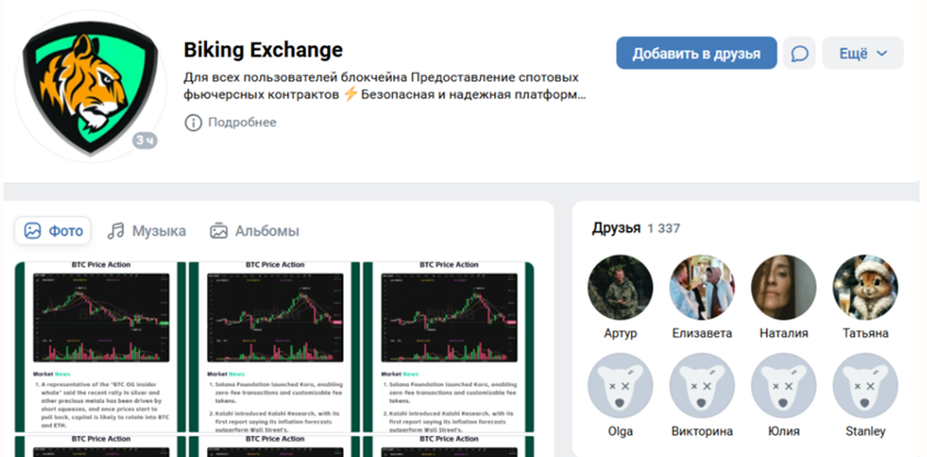 У проекта есть сообщество в VK BiKing Exchange, где публикуются новости и полезная информация. В группе более 1300 пользователей, но основная их часть – это неактивные или удаленные подписчики. Данный факт – показатель искусственной накрутки, что использовали разработчики для обеспечения популярности площадки. В работе использованы нечестные методы продвижения.
