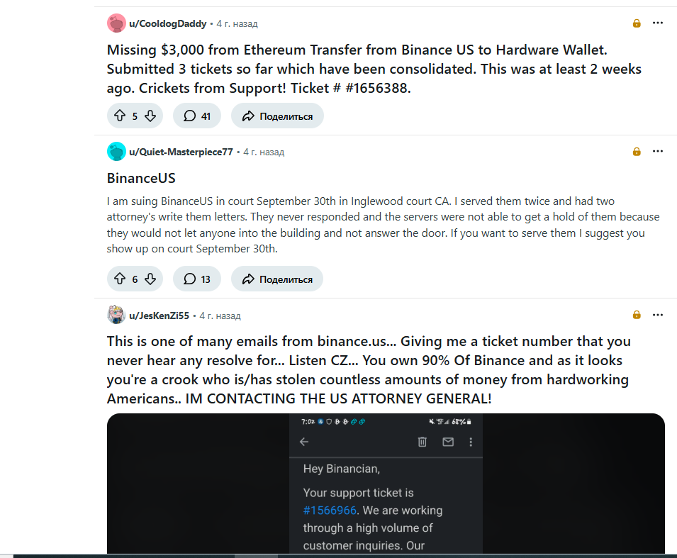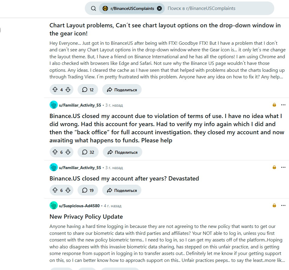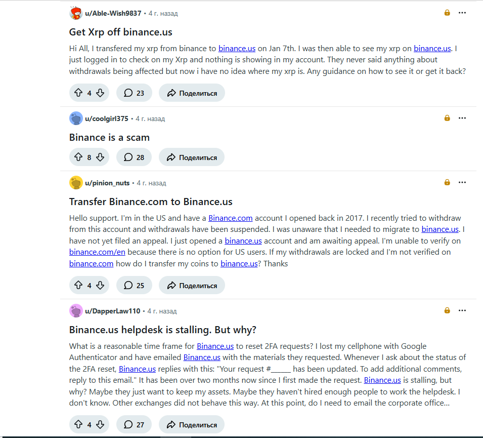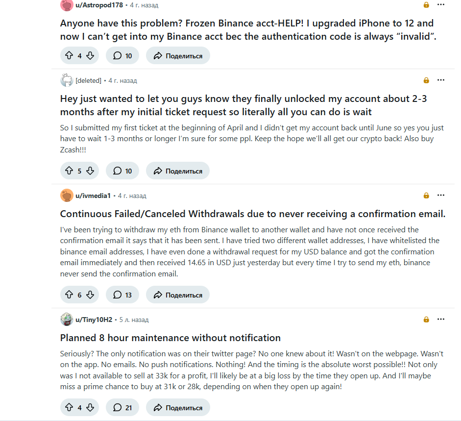 Существует отдельный сабреддит r/BinanceUSComplaints, где за несколько лет накопилось много кейсов. Там пользователи жалуются на очень медленную или отсутствующую поддержку, зависающие тикеты, проблемы с 2FA и невозможностью войти в аккаунт, “застрявшие” выводы и блокировки аккаунтов.