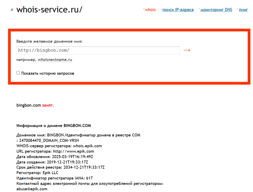 Чтобы убедиться в честности площадки Bingbon Com, необходимо проверить ее деятельность. На сайте указано, что работа ведется с 2018 года. На самом деле доменный адрес был зарегистрирован в 2019 году, но только в 2025 он перешел этой криптовалютной бирже. Проверка показала, что домен продлили до 2034 года. На данный момент при попытке открыть сайт появляется ошибка, поэтому обзор составлен на основе информации, которая была найдена в свободном доступе.