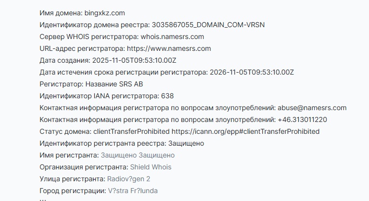 Домен bingxkz com зарегистрирован 5 ноября 2025 года, он пока плохо настроен и работает с перебоями. Владельцы заявляют, что это международный сервис с “азиатским охватом”, а ее серверы находятся в Гонконге. Но по данным WHOIS сайт размещен на швейцарском хостинге Name SRS AB.