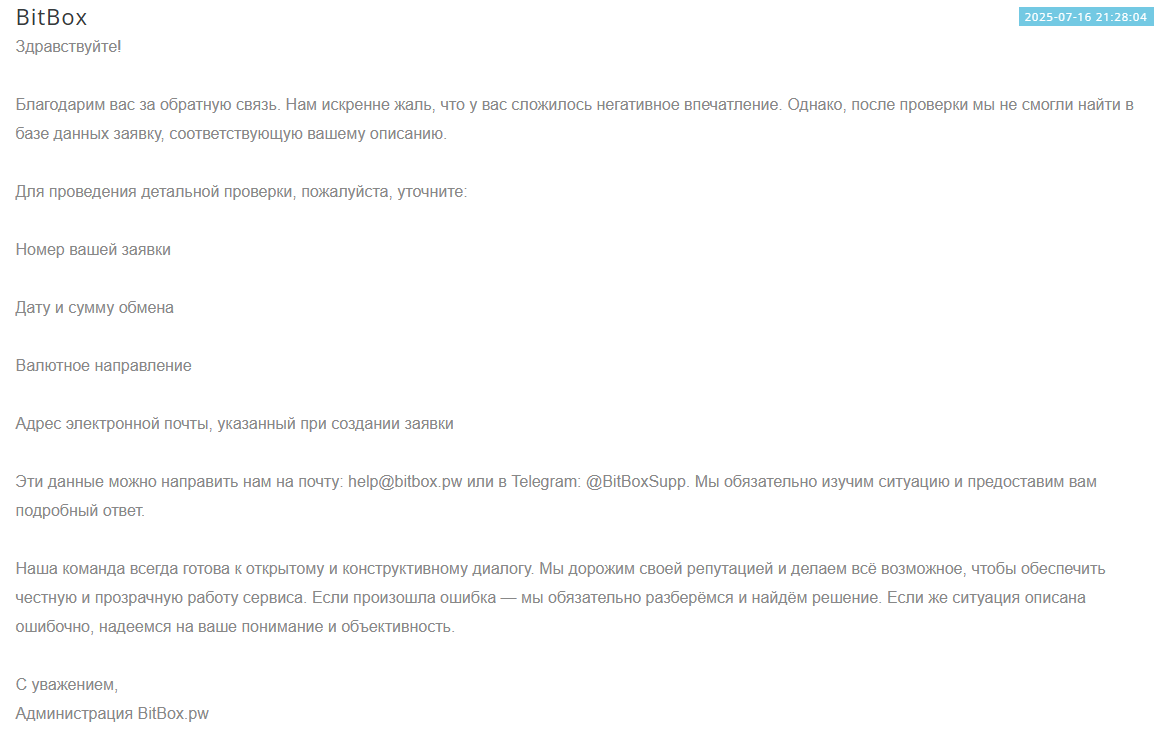 На негативные отзывы команда обменника реагирует грамотно: клиента просят связаться со службой поддержки для уточнения всех вопросов и решения проблемы.