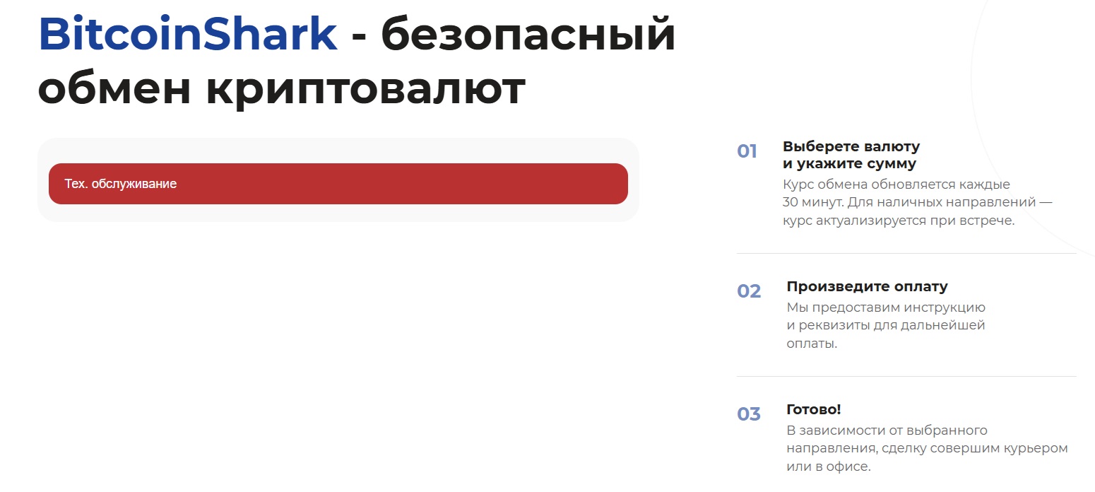 Официальный сайт bitcoinshark.exchange имеет лаконичный дизайн. На главной странице размещена пошаговая схема работы: выбор валюты и суммы, оплата по предоставленным реквизитам и завершение сделки. Сайт позиционирует сервис как «безопасный обмен криптовалют» и упоминает возможность совершения сделок через курьера или в офисе. Функционал ограничен базовой информацией и, предположительно, формой создания заявки.