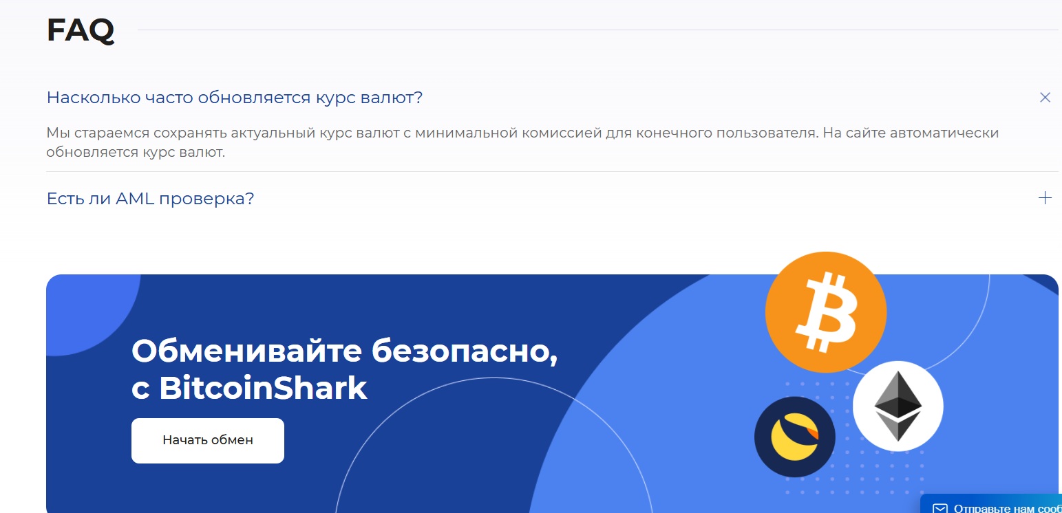 BitcoinShark Exchange представляется как обменник, который работает только с криптовалютой. Он не выводит деньги в обычные рубли или доллары — только меняет одни цифровые активы на другие.