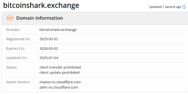 Проверка домена через WHOIS показывает, что домен bitcoinshark.exchange был зарегистрирован 2 марта 2025 года. Это означает, что на момент анализа проект существует менее года. Данный факт не соответствует возможным негласным ожиданиям пользователей о длительной и проверенной истории работы подобных финансовых сервисов.