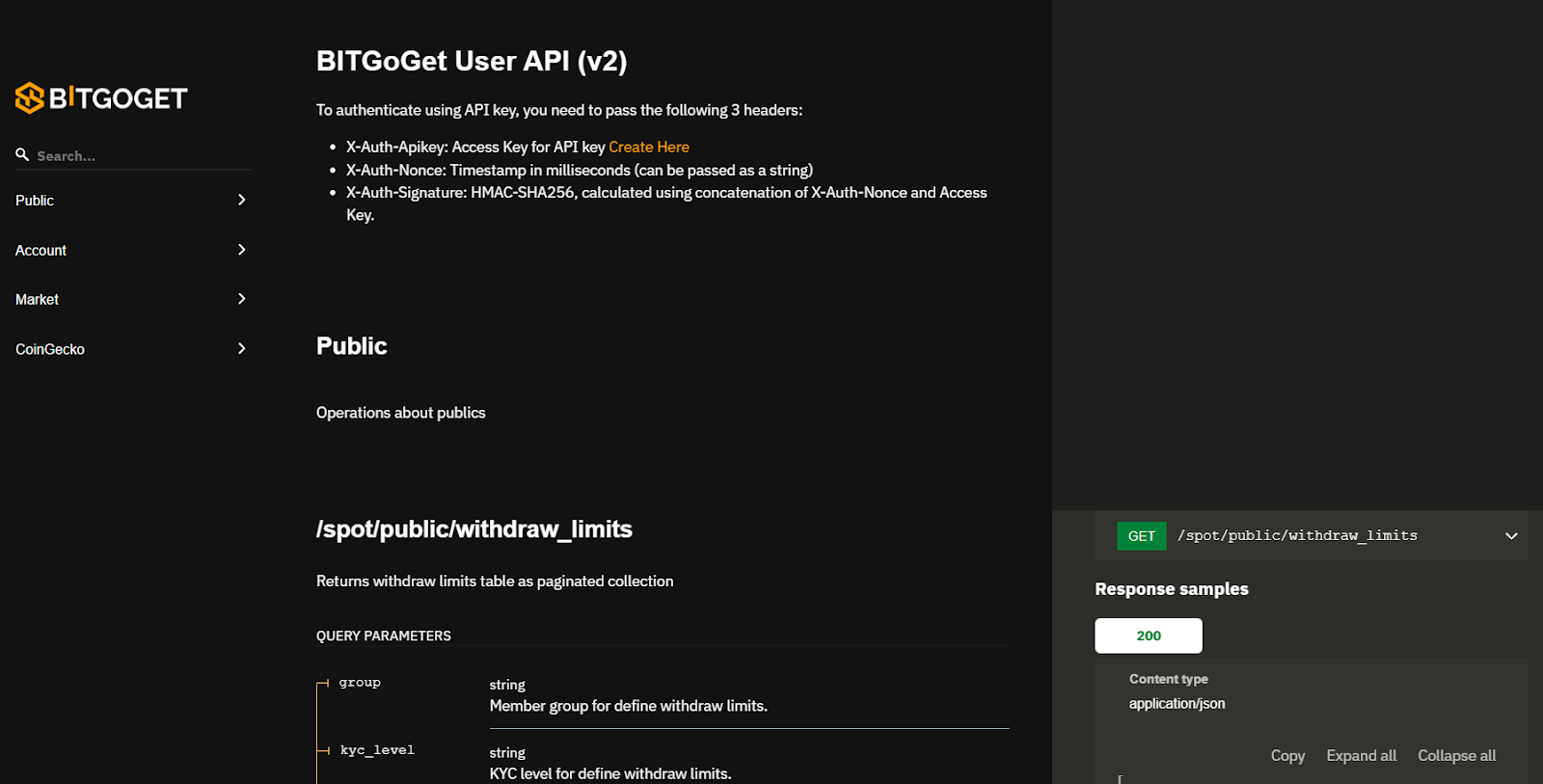 На уровне технической оболочки биржа выглядит профессионально. Есть API, статус здоровья сервисов, версии, вебхуки, описание лимитов по KYC, история транзакций, ордербуки и все то, что обычно присутствует у работающих бирж.