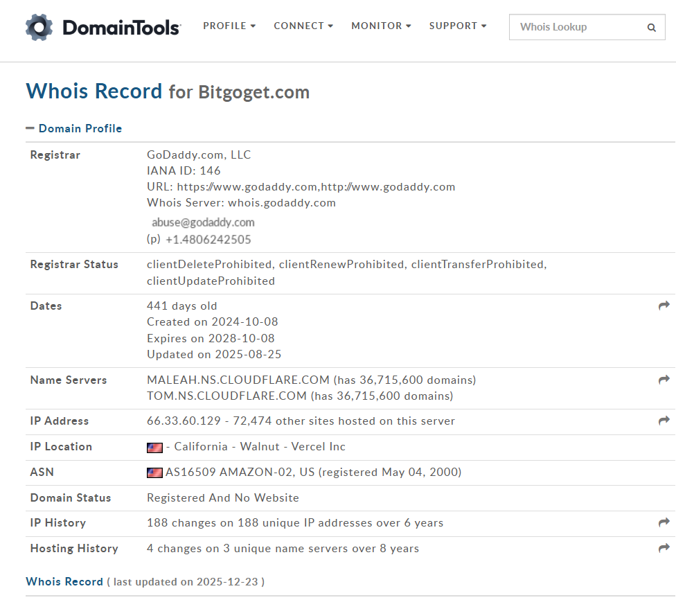 Домен зарегистрирован в октябре 2024 г. через GoDaddy, юридическое лицо не раскрывается, адрес компании и регистрационные данные отсутствуют. На сайте нет информации о лицензии, регуляторе или даже стране регистрации, что для крипто-биржи, работающей с деньгами клиентов, является серьезным минусом.