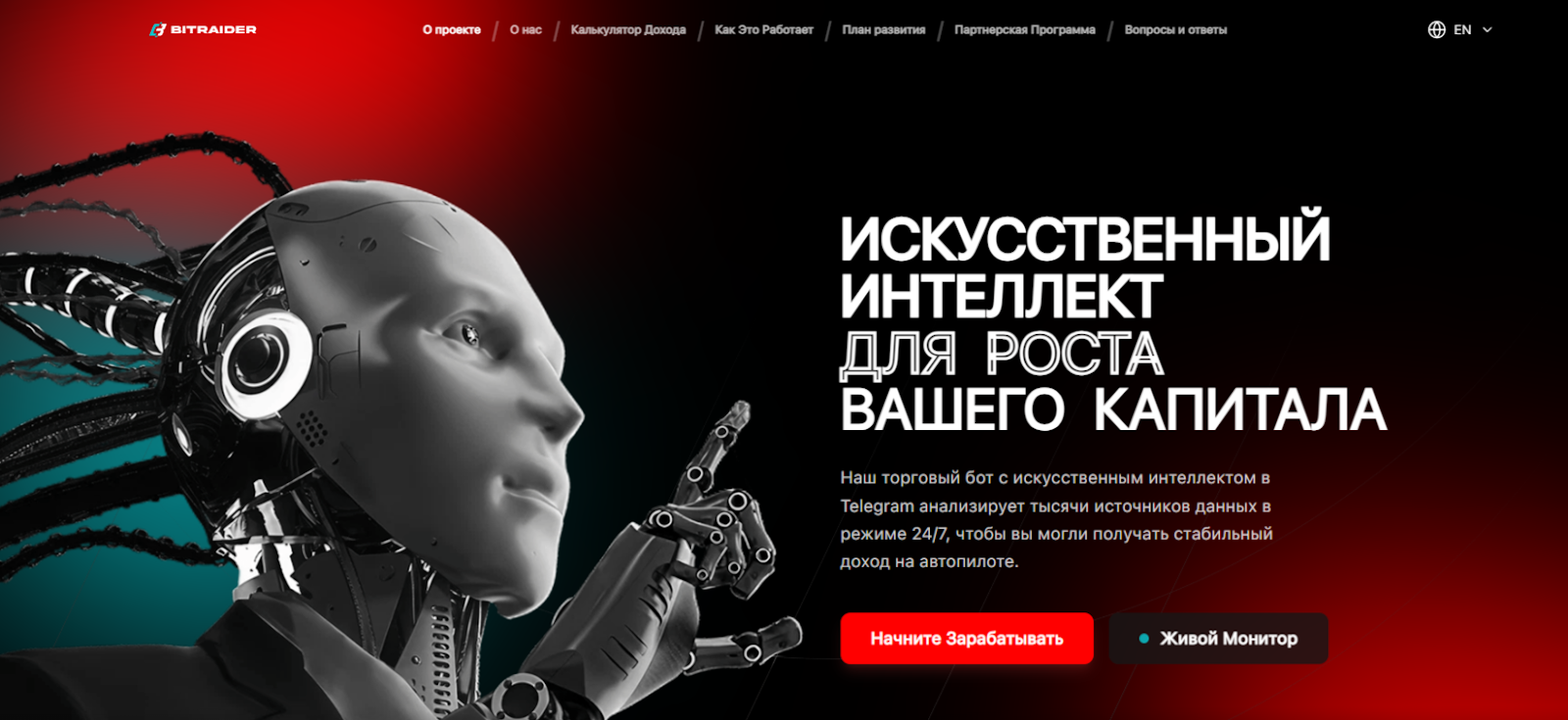 Организация Bitraider AI LTD была зарегистрирована в Великобритании летом 2025 года. Молодая компания предлагает целевой аудитории вкладывать финансовые инвестиции в торгового bitraiderai bot. Автоматизированная программа на базе ИИ является своеобразным финансовым аналитиком, торгующим на глобальных рынках. На инвестиционной платформе Bitraider пользователям доступен ряд опций: