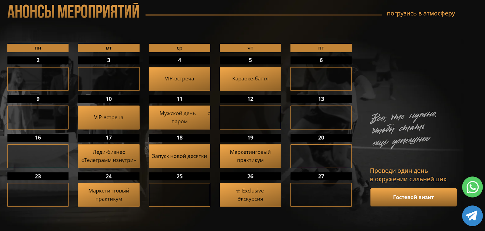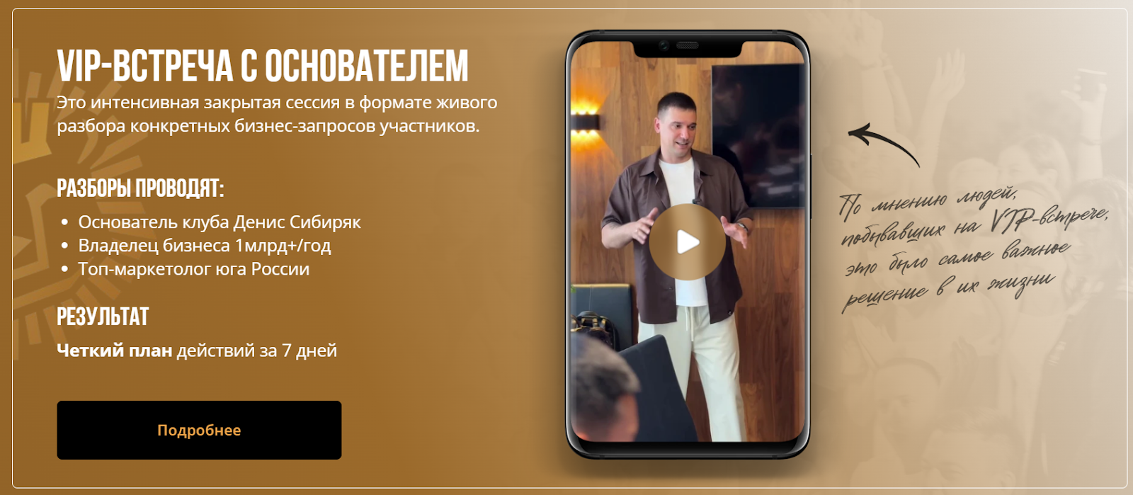 На официальном ресурсе Sibiryakclub представлено расписание мероприятий. Это касается как встреч и прочих моментов, связанных с бизнесом, так и неформальных встреч. К примеру, в определенные даты можно записаться на личную встречу с основателем. Она проводится в VIP-формате. Ее описывают как закрытый интенсив, где проводится разбор запросов людей. Все ведется основателем клуба Денисом Сибиряком. По результатам встречи он составляет план действий на ближайшие 7 дней.