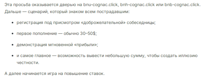 По итогу пострадавшие остаются с минусом на счету и заблокированным балансом. Существенных отзывов от таких людей о проекте Bnh Cognac Click мы не обнаружили.