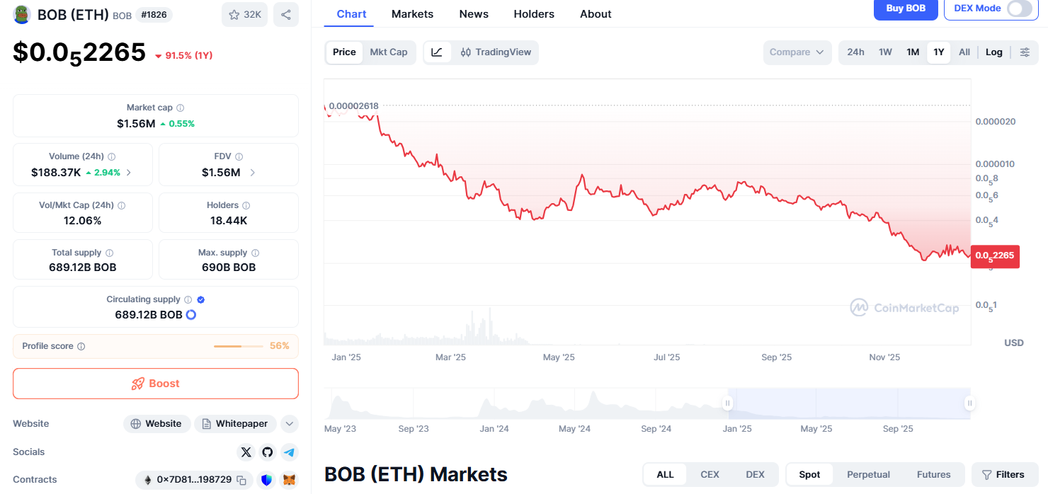 По состоянию на декабрь 2025 года курс монеты Bob составляет около 0,000002 USD. За последний год стоимость коина упала уже на 91,5%. Постепенно уменьшается и объем торговли, сейчас он равняется 188 тысячам долларов. Большинство сделок с ней заключают на платформе KCEX.