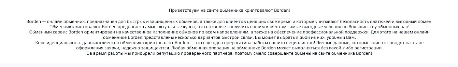 Borden — это просто сайт для обмена криптовалюты на другие деньги и обратно. Он обещает быстрые и безопасные операции. Кто стоит за этим сервисом — неизвестно. Ни имен, ни истории компании на сайте нет. Всё обезличено, есть только логотип и инструкции.