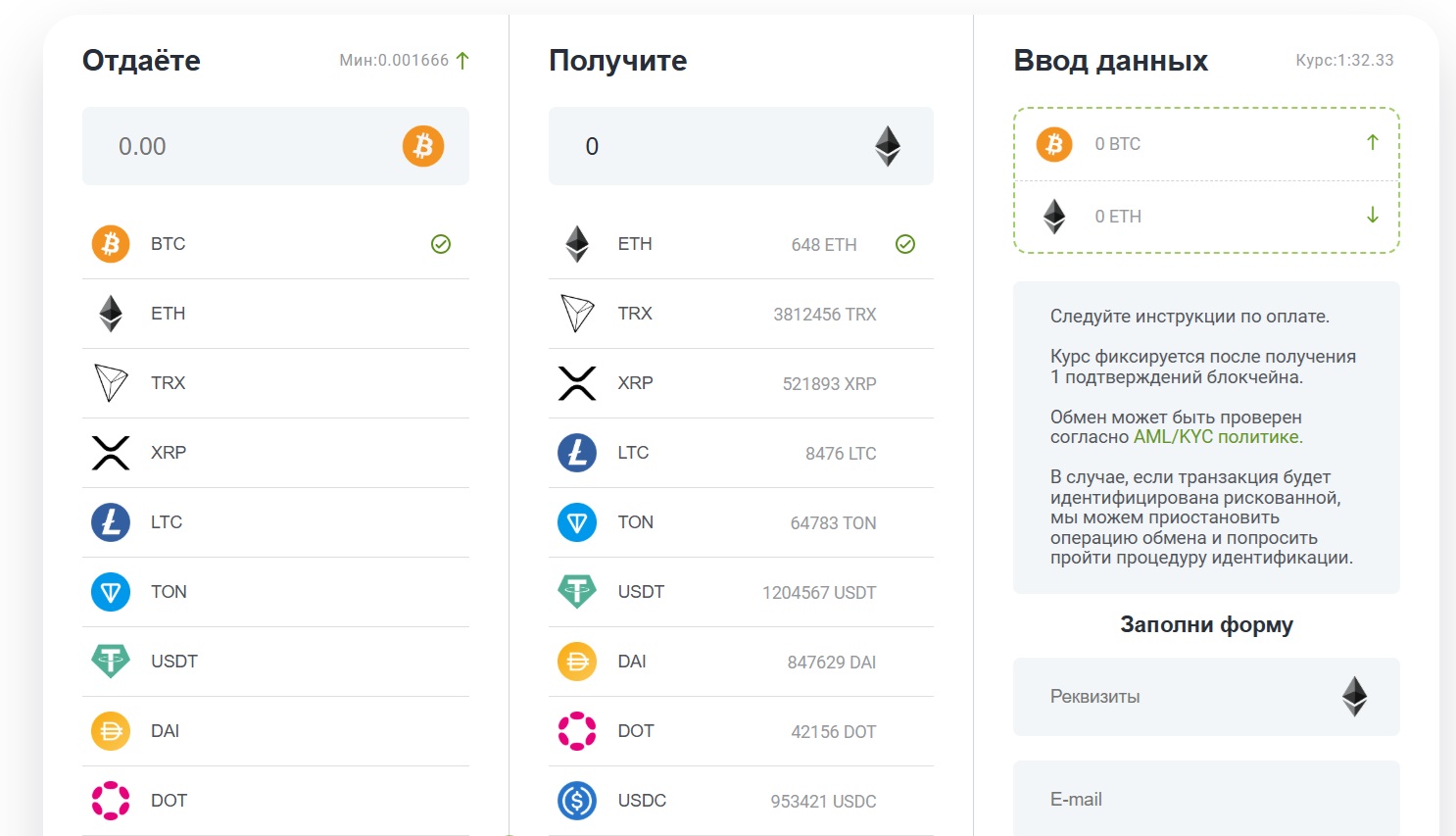 Borden занимается только одним — обменом криптовалют. Всё работает по стандартной схеме: вы заходите на сайт, выбираете, что и на что меняете, вводите сумму и свои реквизиты. После этого система показывает, куда перевести деньги.