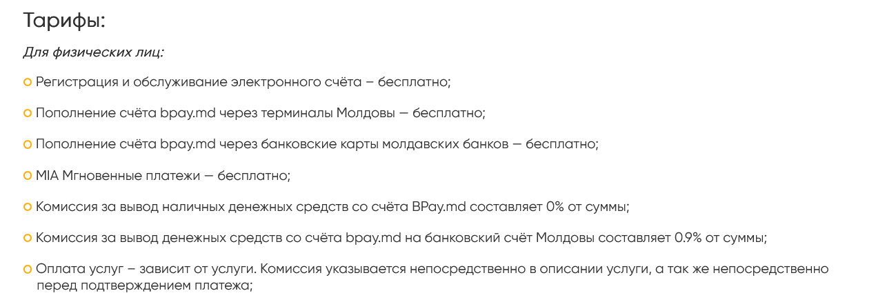 С помощью ресурса физлица могут проводить платежи бесплатно, комиссия за вывод средств наличности со счета компании составляет 0%, а за аналогичную операцию, но проведенную через карту любого банка Молдовы придется заплатить 0,9% от суммы.