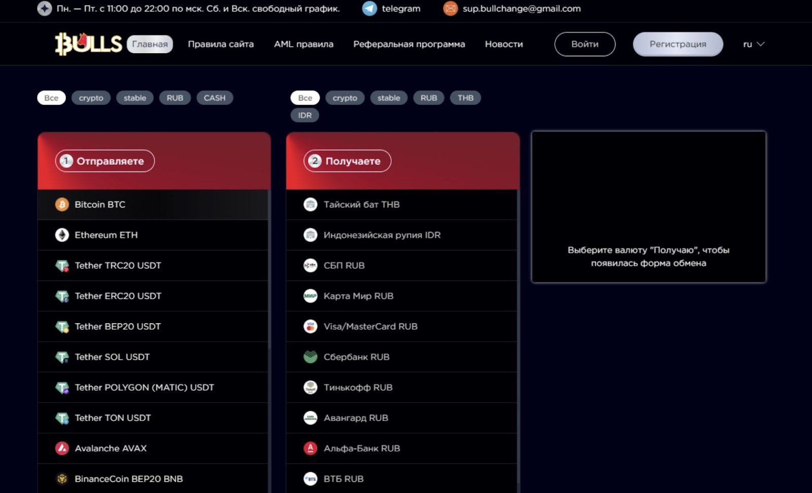 BullsChange com предоставляет доступ к 50 платежным направлениям, среди которых присутствуют не только криптовалюты, но также наличные средства, рубленые карты и различные сервисы.