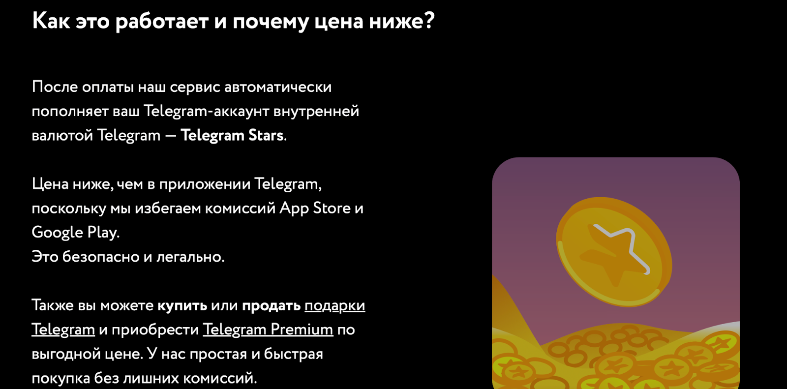 BuynStars позиционирует себя как удобный онлайн‑сервис для приобретения внутренней валюты Telegram Stars, подарков и подписки Telegram Premium. По заявлениям площадки, пользователи могут сэкономить: цены якобы ниже официальных, поскольку сервис обходится без комиссий магазинов приложений, а транзакции проводятся «без лишних сборов».