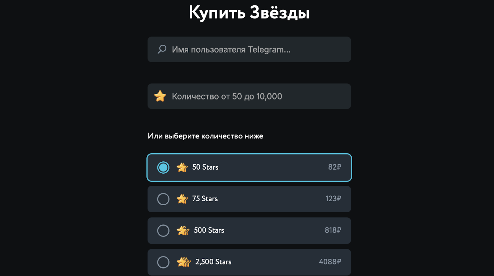 Механика процесса следующая: пользователь заходит на сайт платформы или в телеграм-бот, выбирает нужный пакет «звезд» от 50 до 10 тысяч и оплачивает. Далее ему нужно дождаться пополнения счета на указанную сумму.