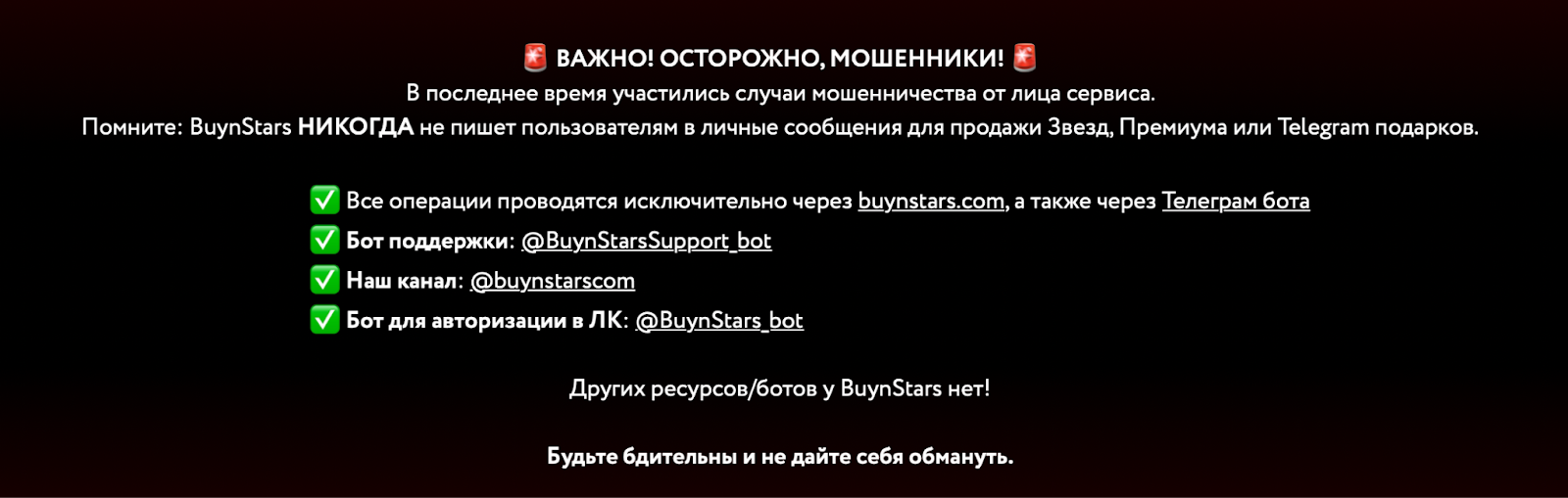 Особого внимания заслуживает дисклеймер: сервис предупреждает посетителей о мошенниках, которые якобы пытаются выдавать себя за BuynStars. Это выглядит как попытка обезопасить аудиторию и убедить ее в том, что «настоящий» сайт только один. Наличие таких предупреждений невольно наводит на мысли: если приходится так активно предостерегать от подделок, значит, проблема действительно существует.