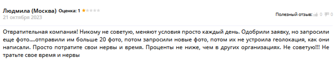 Но не все отзывы о ООО МФК Кэшмотор хорошие. Есть негативные комментарии, которые касаются отказов в займах. По словам некоторых клиентов рассмотрение длительное, сотрудники часто требуют дополнительные фото и справки. Также есть обвинения, что хорошие отзывы об Инвестициях и займах от Кэш Мотор куплены.