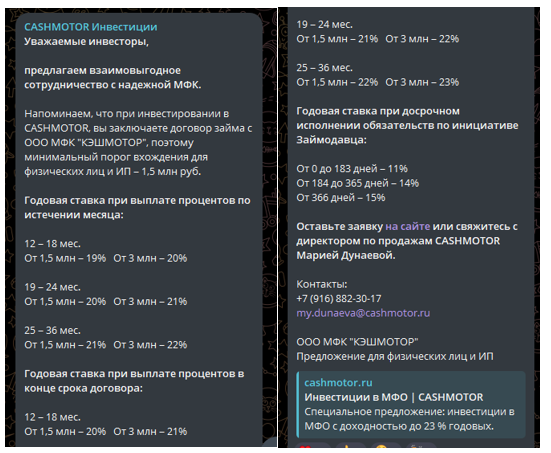 Займы от Cashmotor можно оформить на сайте онлайн или в одном из офисов компании. Также клиентам предлагается пассивный доход. Инвестируемые средства обеспечиваются залогом – автомобилями, покрытие – от 200%. Сроки договора разные – от 12 месяцев до 3 лет под 23% годовых. Подписать договор можно удаленно при помощи приложения, у курьера или в представительстве МФК.