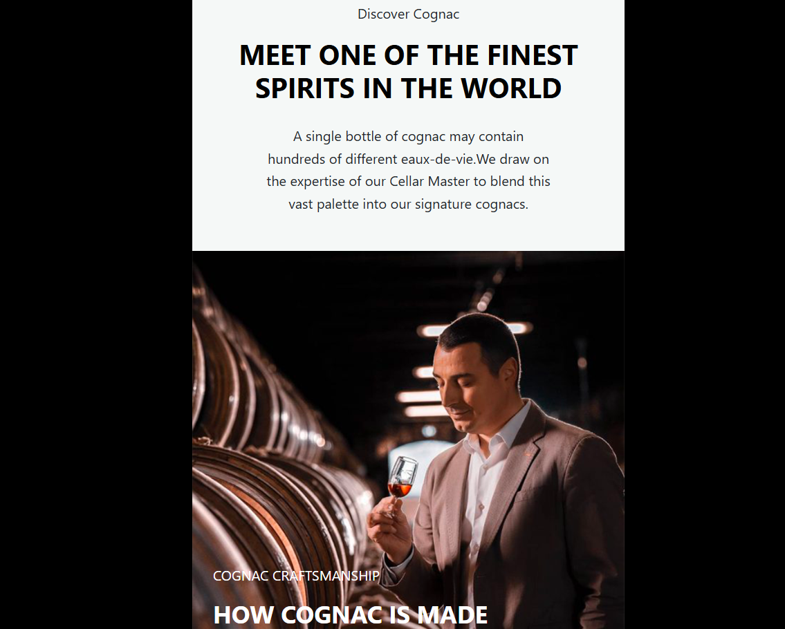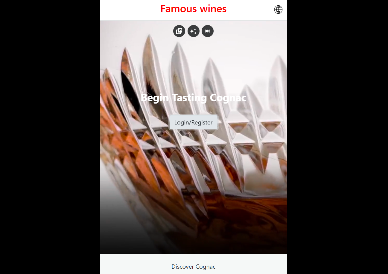 На сайте тексты про коньяк, коктейли, атмосферу премиального алкоголя, используется логотип с фразой famous wines, которая должна создавать ощущение причастности к чему-то статусному и дорогому.