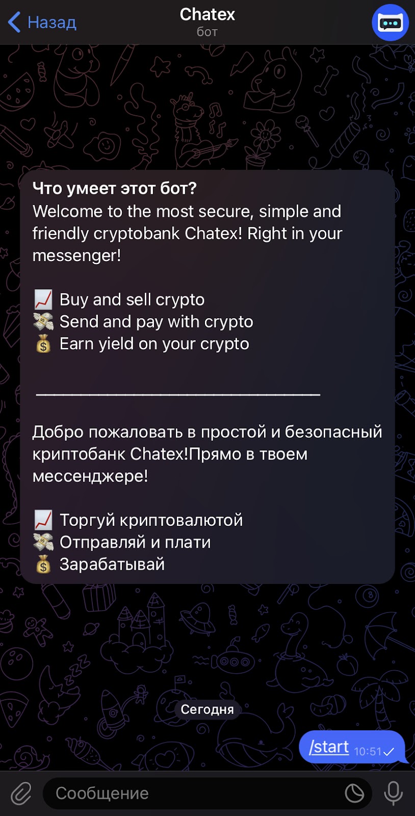 В Telegram у проекта есть Chatex bot. Это мини-версия биржи прямо в мессенджере. Сервис работает именно в таком формате. Мы не удержались от проверки его работоспособности, но все завершилось буквально на старте — бот не функционирует.