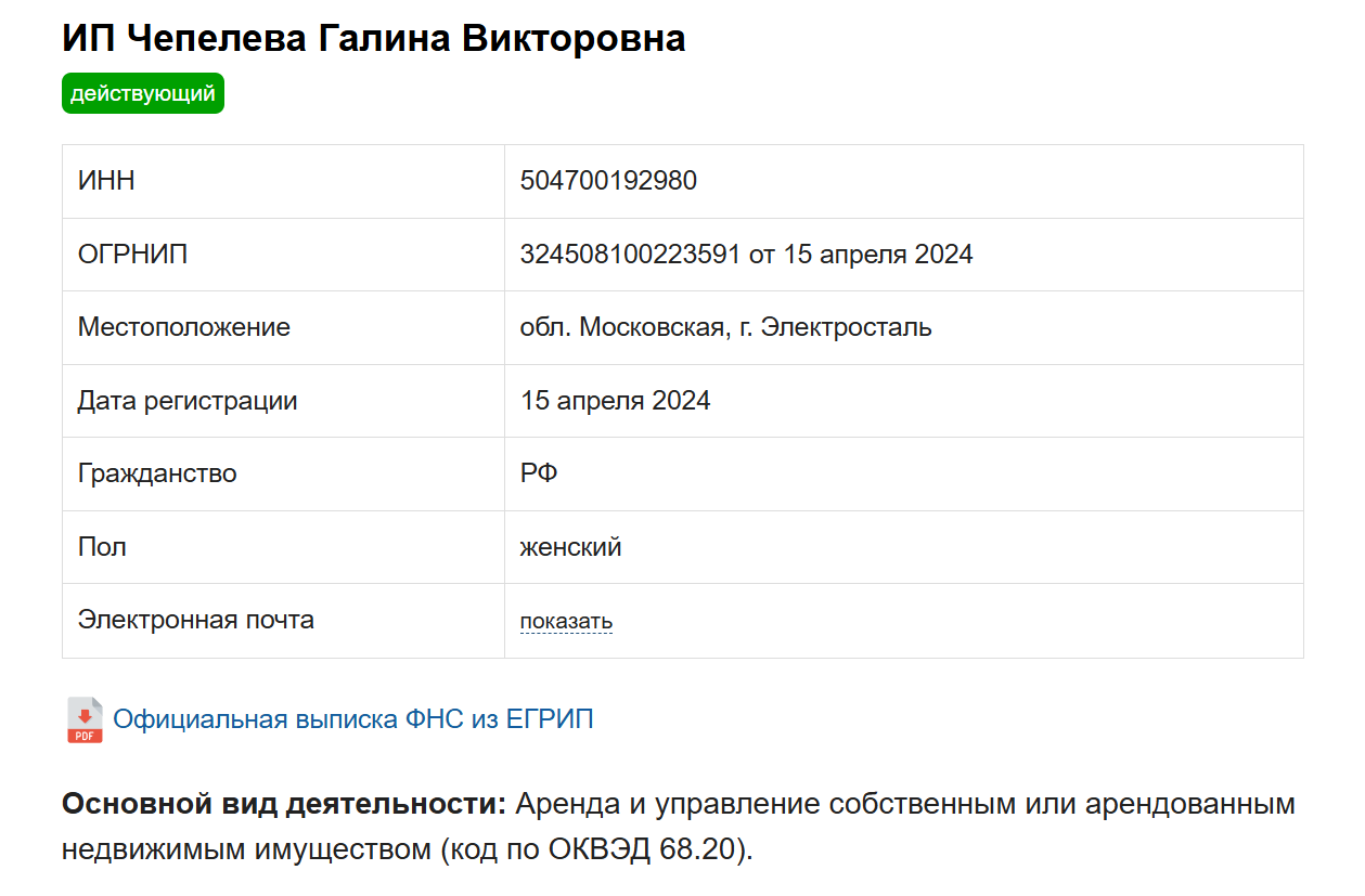 В качестве руководителя приводится ИП ЧЕПЕЛЕВА ГАЛИНА ВИКТОРОВНА. Проверка показала, что такой предприниматель действительно существует. Женщина зарегистрирована в городе Электросталь, Московская область. Заявленное направление деятельности — аренда и управление собственным / арендованным недвижимым имуществом.