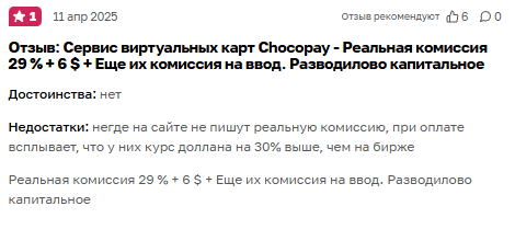 Chocopay — реальная платежная система для выпуска виртуальных карт. Сервис действительно работает, со стороны клиента не будет жалоб на то, что деньги не пришли или платеж заблокировали. Проблема в скрытых комиссиях, которые сильно выше рынка.