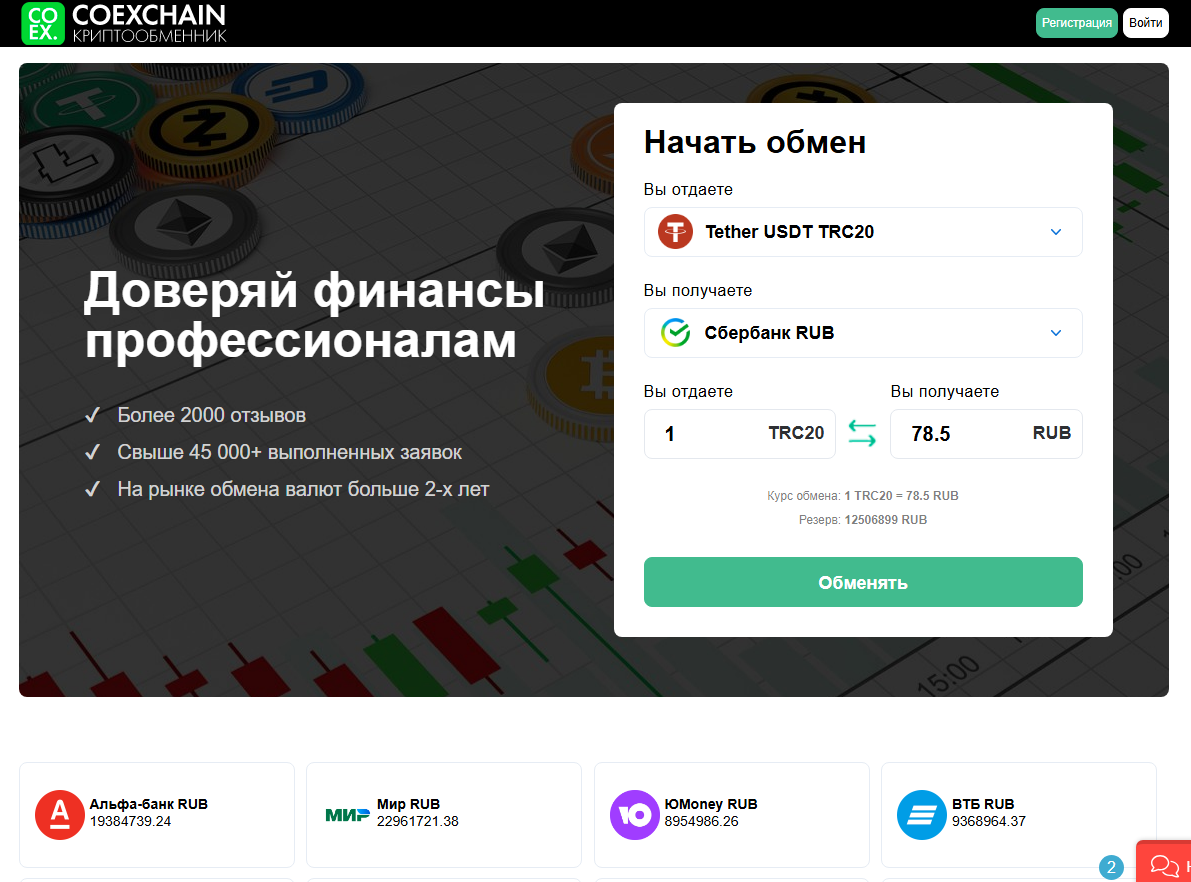 Официальный сайт обменника CoExchain – coexchain com. Предлагает обмен криптовалют, электронных и фиатных денег онлайн по выгодному курсу. Работает круглосуточно. Обещает полную безопасность транзакций и низкие комиссии. Обмен происходит в автоматическом режиме.