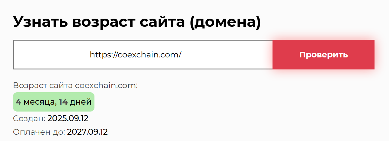 На сайте указано, что работать обменник CoExchain начал в 2025 году. Проверка домена это подтверждает: проекту всего 4 месяца. Доменное имя оплачено до осени 2027 года.