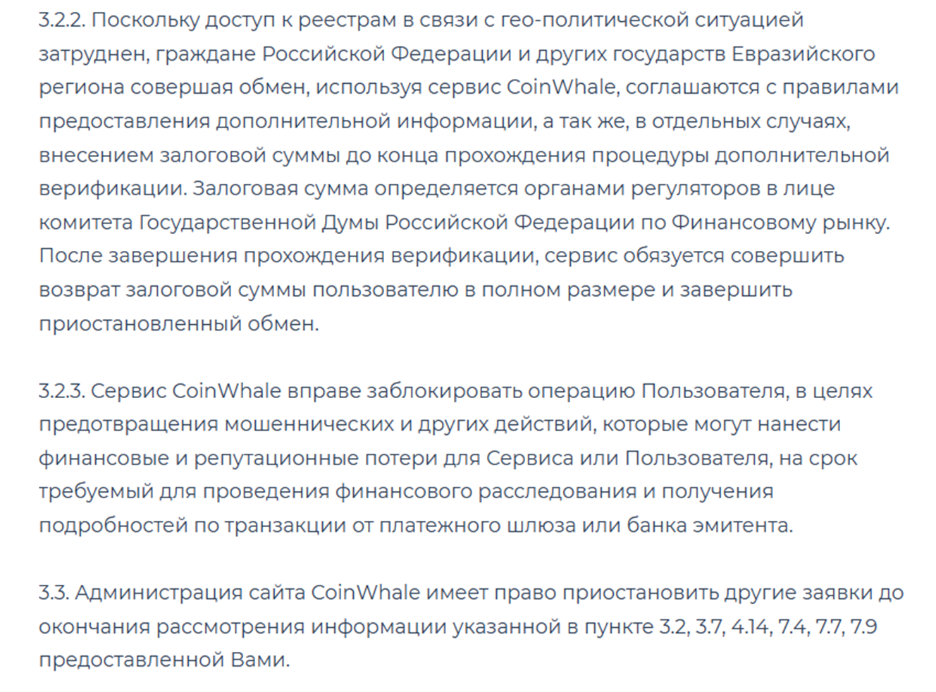 В правилах Coinwhale net сказано, что проект вправе потребовать авансовый платеж с резидентов РФ в связи с геополитической мировой ситуацией. Сумма не уточняется, но она замораживается до исполнения транзакции.