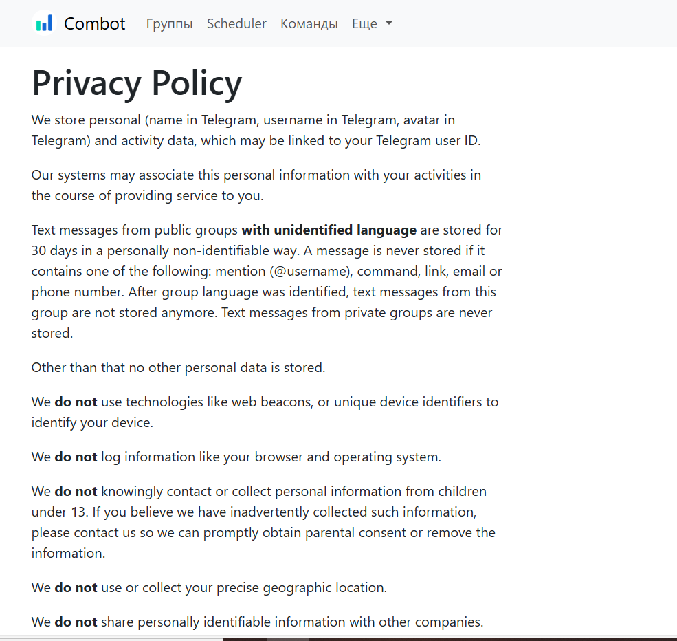 Combot телеграмм — это инфраструктурный инструмент. Масштаб, активные официальные каналы и прозрачное описание того, какие данные обрабатываются, выглядят как признаки зрелого проекта.