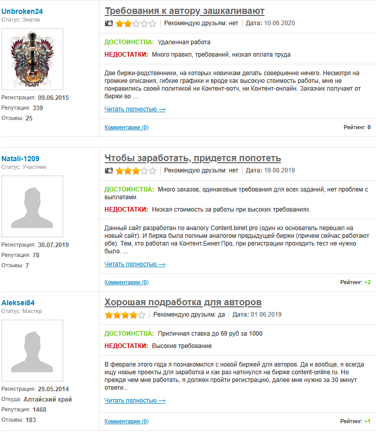 Далее разберем отзывы Контент Онлайн и что в принципе пишут о платформе на независимых ресурсах в сети. Их не так много, но они есть, однако смешанные. Достоинствами авторы отмечают надежные выплаты, подробные условия и отсутствие проблем с поиском работы — заказы всегда есть.