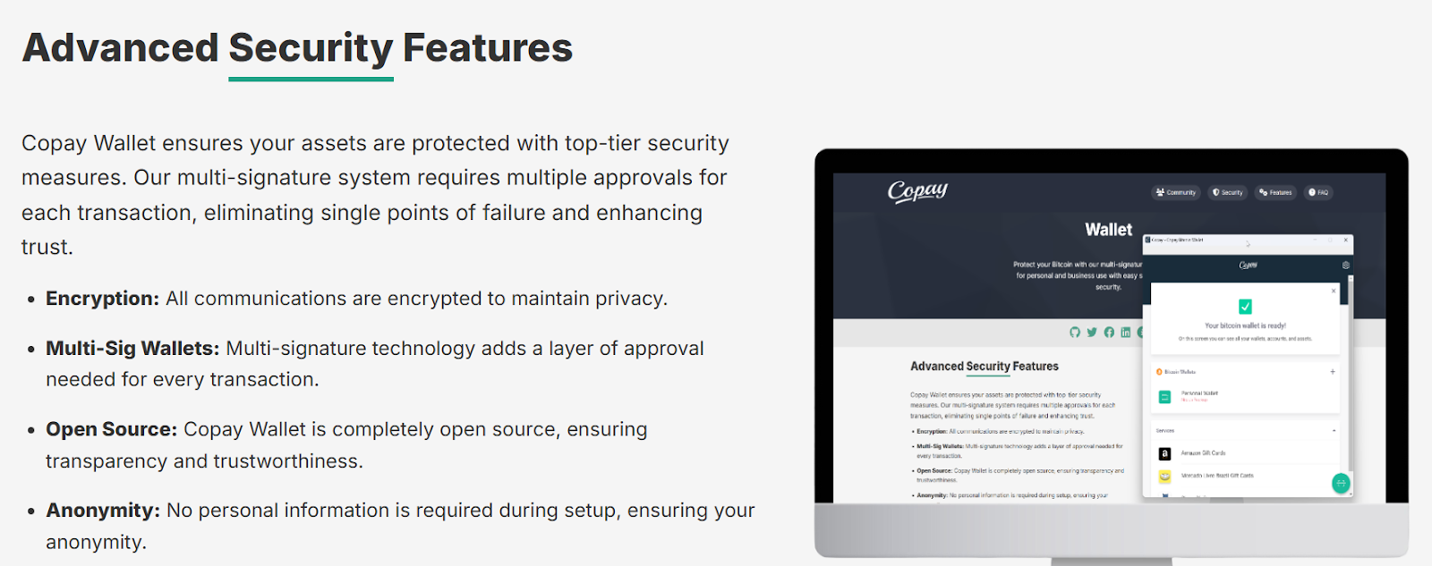 Исходный код Copay Wallet изначально публиковался на GitHub. Это позволяет независимым разработчикам и экспертам проверять надежность ПО, искать уязвимости и участвовать в развитии проекта. Такой подход повышает уровень доверия в криптосообществе. Обо всех действиях со счетом приходит уведомление на электронную почту пользователя.Хранение криптовалюты и транзакции происходят исключительно на стороне клиента. Данный проект не управляет средствами пользователей напрямую. Несмотря на обещания и условия безопасной работы, пользователи могут столкнуться с подделками, о чем есть информация в сети. Поддельные версии Copaywallet org могли собирать приватные ключи или данные.