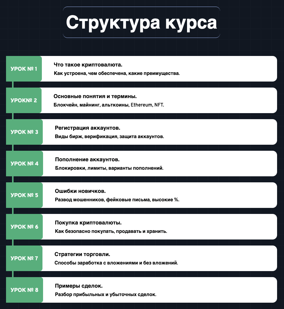 Также следует учитывать, что данная программа нацелена на абсолютных новичков, которые не умеют пользоваться даже криптовалютными кошельками. Таким людям под видом полезного продукта могут продать все, что угодно.Чаще всего подобные курсы организуют для продажи уже подогретым клиентам дорогостоящего платного обучения. Другой вариант — это заманивание новичков в крипто-инвестировании в скам-схемы, результат участия в которых всегда один — потеря денег.