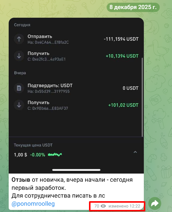 Отчет о работе с клиентами презентуется в виде скринов. Отметим, что такие картинки выставляют практически все аферисты – подделать их легче всего. Еще один нюанс – данный пост от 8 декабря 2025 года за 10 дней просмотрело всего 70 участников. Количество просмотров последних новостей также не превышает и сотни, при этом до 3 декабря индикатор показывал стабильно по 2 тыс. просмотров.