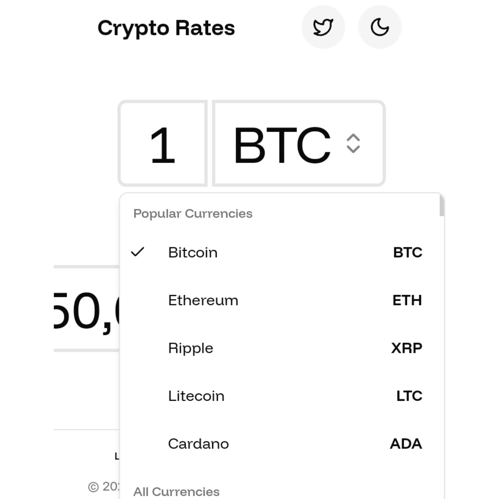 Данный проект работает через веб-ресурс crypto rates io, но сейчас, перейдя на сайт, доступна только строка с валютами. Вверху страницы предоставлен режим смены темы платформы, а еще ссылка на страницу в X.