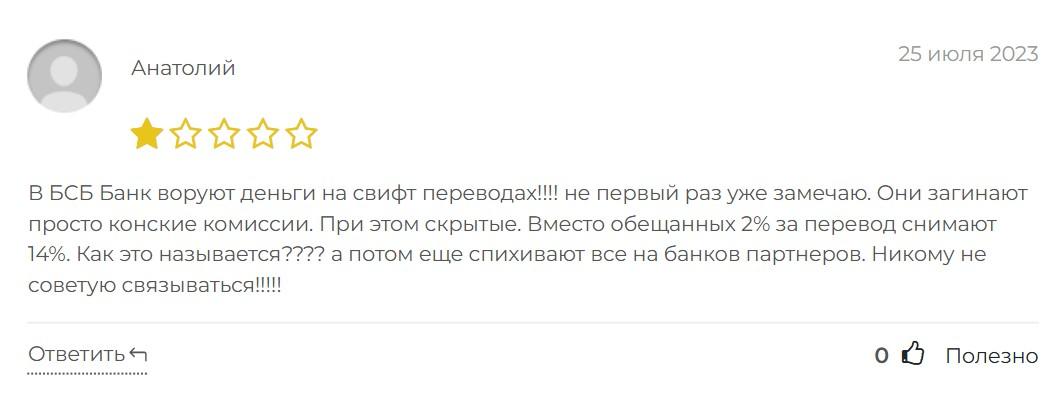 В интернете отзывов о кошельке нет. Но «БСБ Банк» имеет неоднозначную репутацию. Есть негативные отклики, жалобы на высокие комиссии и плохое обслуживание.