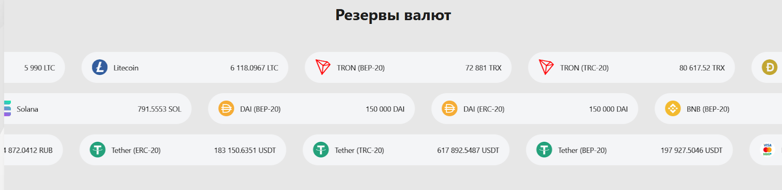 Сервис поддерживает много направлений, включая фиатный рубль и всю популярную крипту в разных сетях. В списке «КриптоФьюжен» есть, например, операции с СБП, банковским картами, BTC, ETH, SOL, BNB, TRX, USDT и пр. Отдельно отображаются резервы валют. На сайте видно, что запас по большинству монет довольно крупный, а значит сервис способен обрабатывать и относительно большие заявки без задержек.
