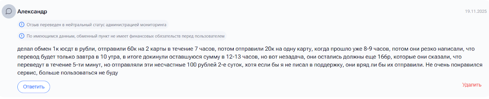 Встречаются также полностью негативные отзывы. В них звучат жалобы на блокировки и удаление перепискок с менеджером в Телеграмм, а также на выплаты меньшей суммы, чем заявлялось.